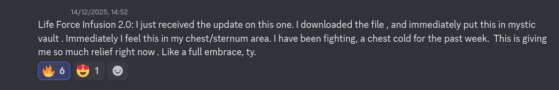 Life Force Infusion System 2.0 is a ground-up reconstruction and major upgrade of the original Life Force Infusion System. Every layer of how life force is refined, delivered, integrated, and sustained has been redesigned to allow the effects to reach deeper, stabilize faster, and express more powerfully in the individual’s real life. It is a smarter, and adaptive vitality infrastructure that permanently upgrades how your system interacts with life force energy itself.