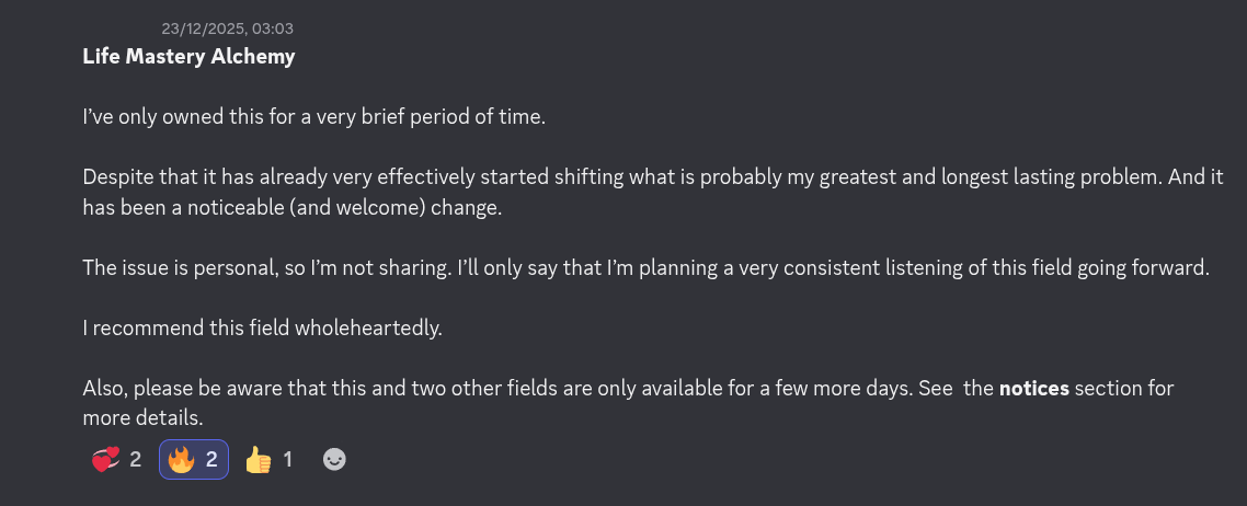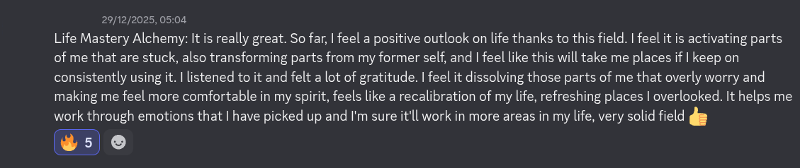 Get Life Mastery AlchemyRead what 455+ community members say about our fields. View testimonials in our Discord.