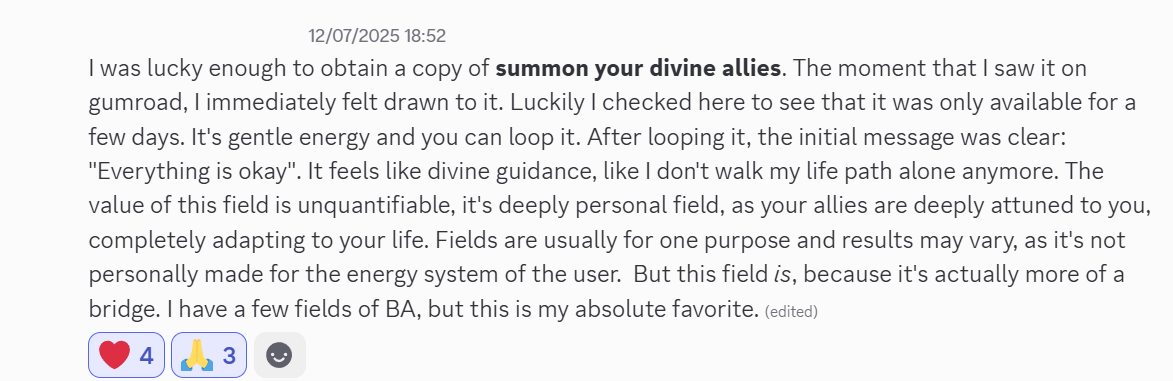 Summon Your Divine Allies is a morphic and energetic field audio created by BA Morphic & Energetic Fields. It works by delivering encoded energetic information to your biofield, supporting transformation at the energetic level.